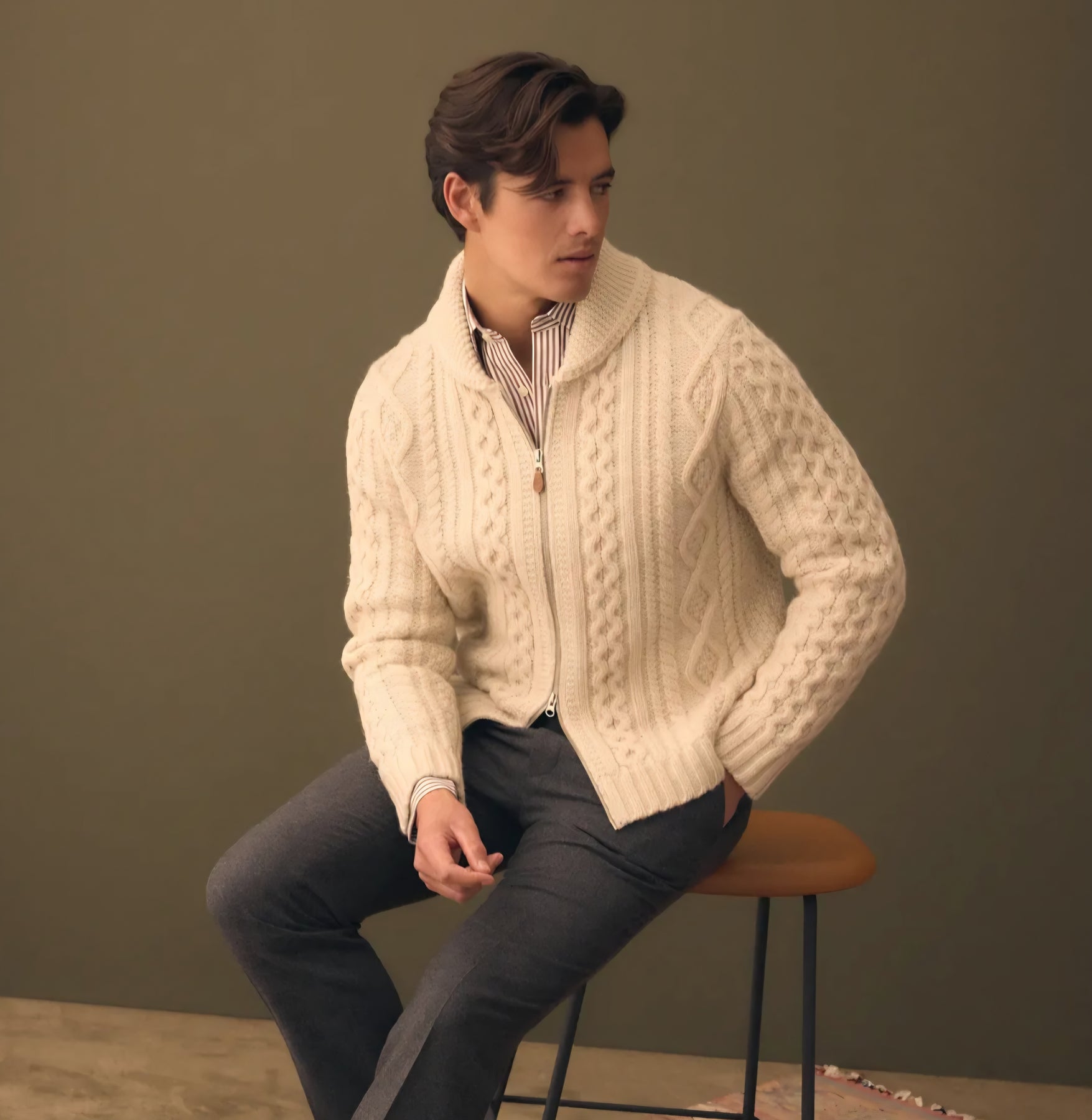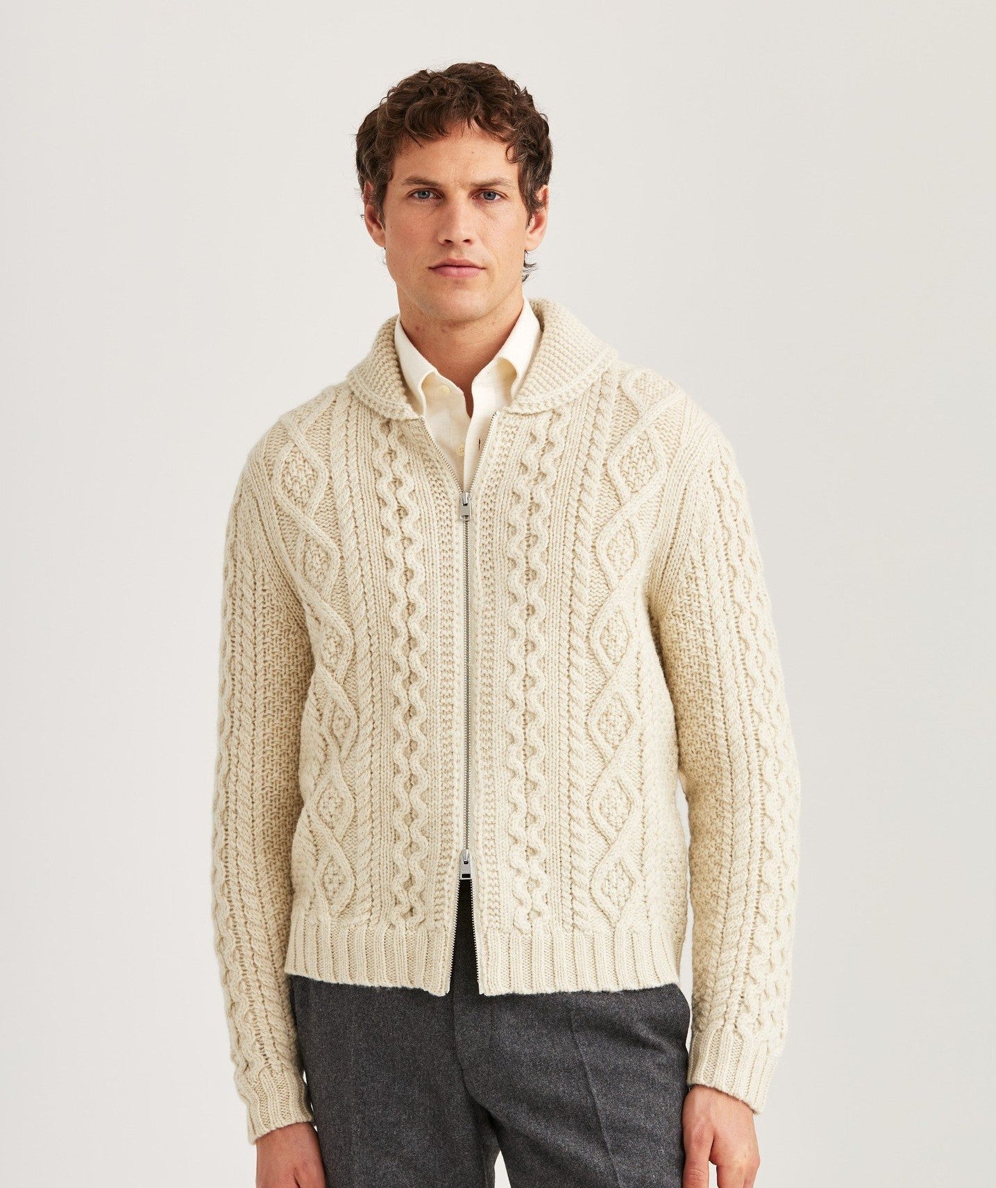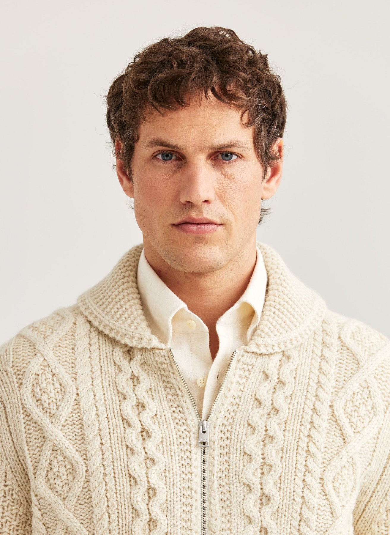 En sømløs fusjon av historie, håndverk og praktisk anvendelse, Cornwall Cable Zip Jacket forbinder brukeren med det rike teppet av irsk tradisjon. Dens varige design, vevd med kulturell betydning, sikrer at den forblir et verdsatt plagg, sesong etter sesong. Style med grå flanellbukser eller jeans.