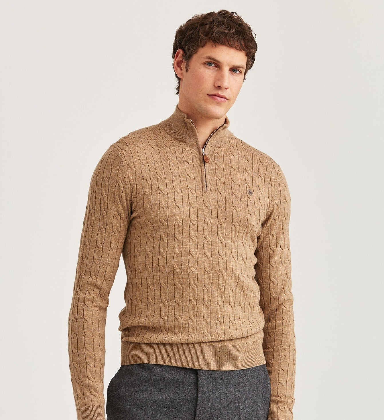 Merino Cable Zip kombinerer to favoritter i ett produkt - den velkjente John Zip med stående krage og glidelås, sammen med klassisk kabelstrikking. Laget av 100 % Merino fra den italienske veveren Biella Südwolle, er dette garnet kjent for sin temperaturregulerende evne, noe som betyr at det holder deg kjølig når det er varmt og varmt når det er kaldt. En investering for alle årstider.