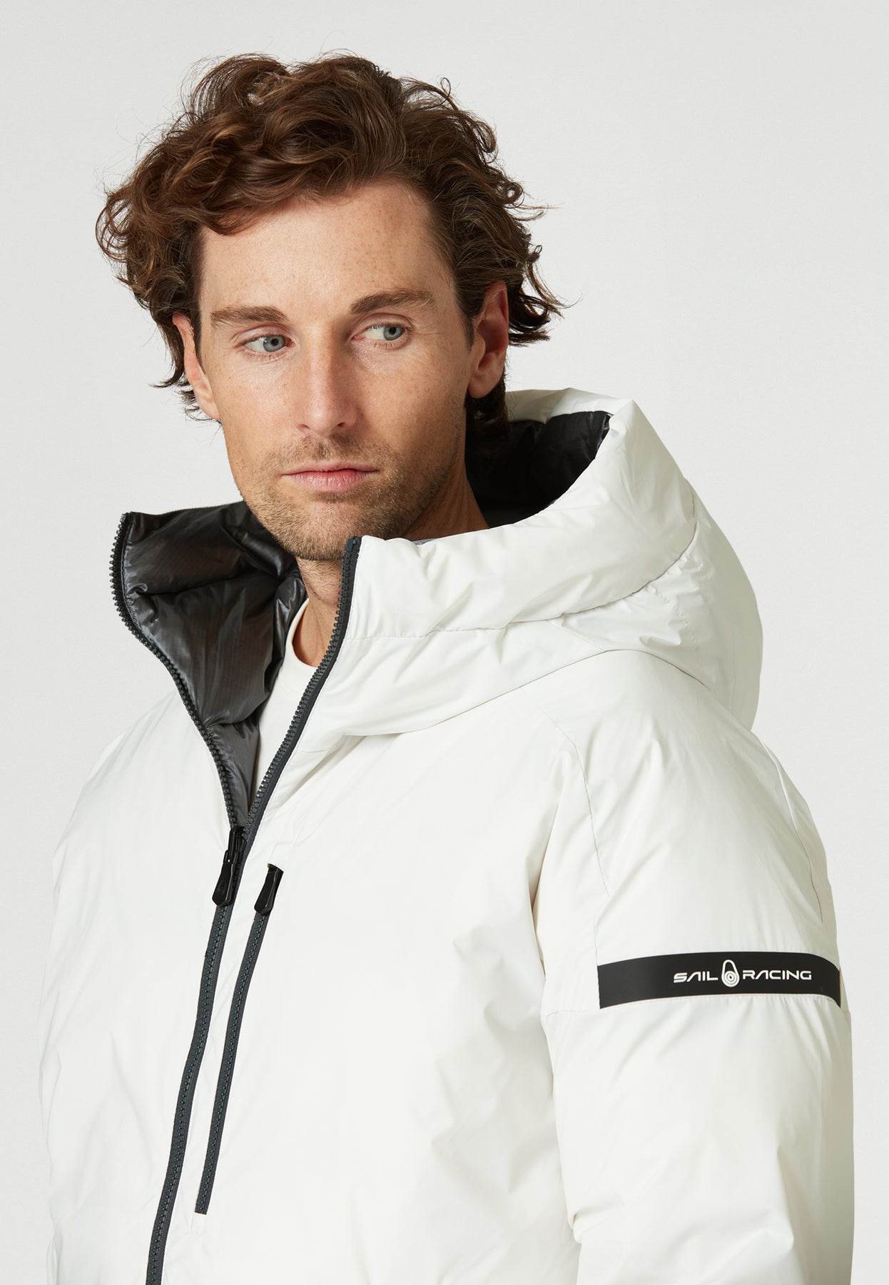 Toveis glidelås. Hetta kan justeres med snøring bak og har en dunfylt kanal rundt åpningen for en mer tilpasset passform som ytterligere beskytter mot været. Elastiske mansjetter for å beskytte mot vindinntrengning. Den glatte vevde siden av jakken er utstyrt med to romslige midjelommer med glidelås, hvorav den vatterte siden har to brystlommer med knappelukking. Alle lommer har børstet trikotfôr for økt komfort.