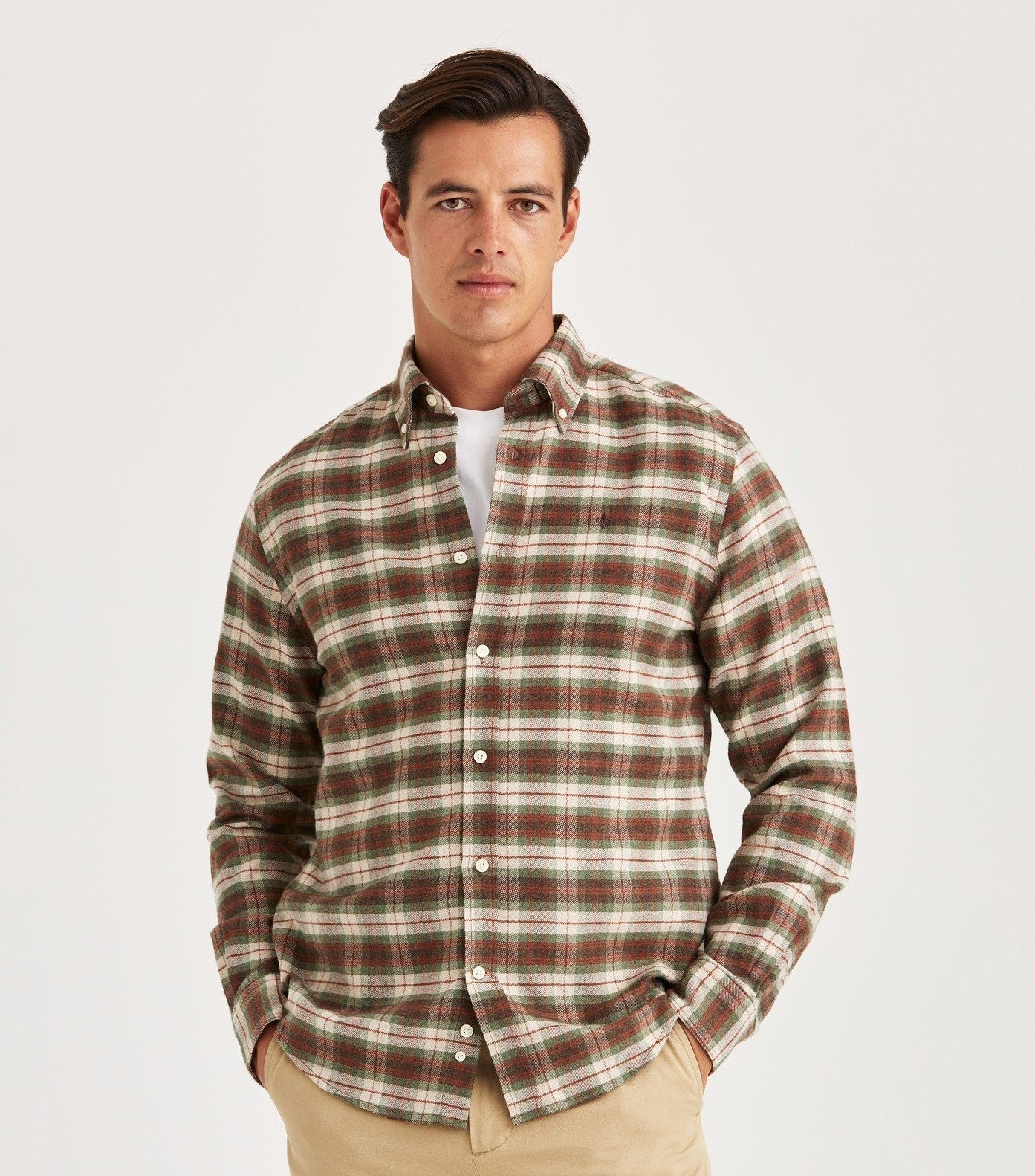 Flannel Check Shirt, en klassisk rutete skjorte i myk, børstet bomullsflanell. Varm uten å føles tung, dette er et plagg som fungerer like godt kneppet opp under en jakke som det gjør åpen over en t-skjorte. Fargepaletten er høstlig – lett å kombinere med denim, kordfløyel eller ull. En hverdagsessens med en tidløs følelse.