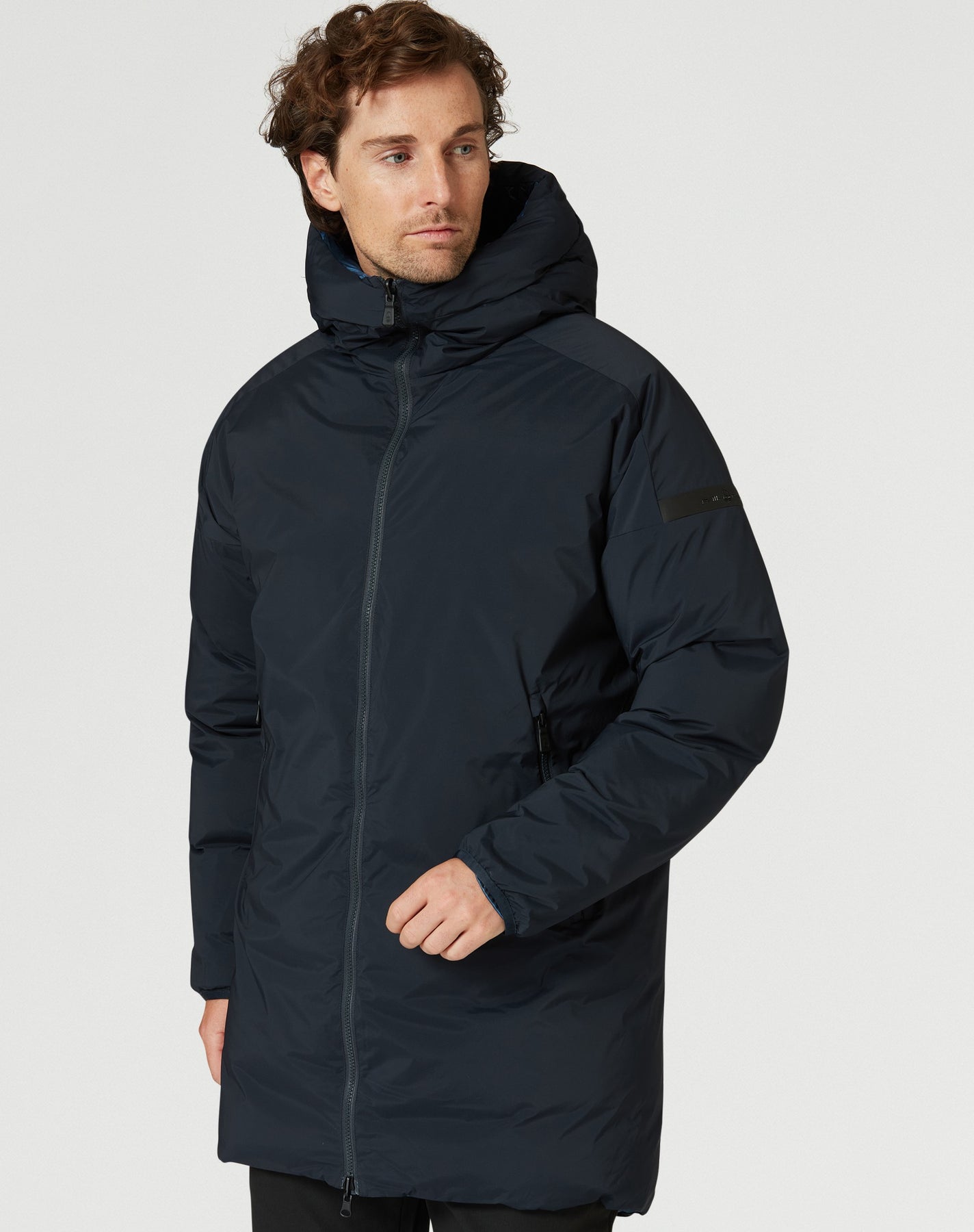 Toveis glidelås. Hetta kan justeres med snøring bak og har en dunfylt kanal rundt åpningen for en mer tilpasset passform som ytterligere beskytter mot været. Elastiske mansjetter for å beskytte mot vindinntrengning. Den glatte vevde siden av jakken er utstyrt med to romslige midjelommer med glidelås, hvorav den vatterte siden har to brystlommer med knappelukking. Alle lommer har børstet trikotfôr for økt komfort.